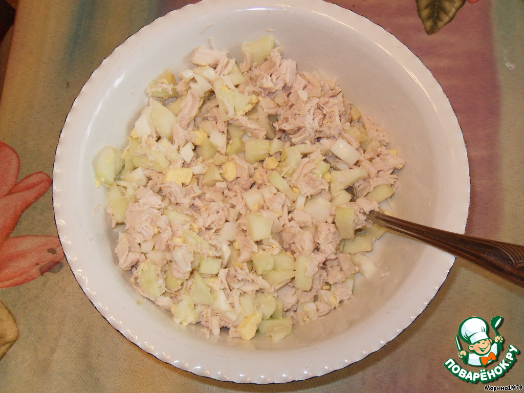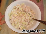 Нарезаем мелкими кусочками курицу, яйца, очищенное яблоко. Все перемешиваем