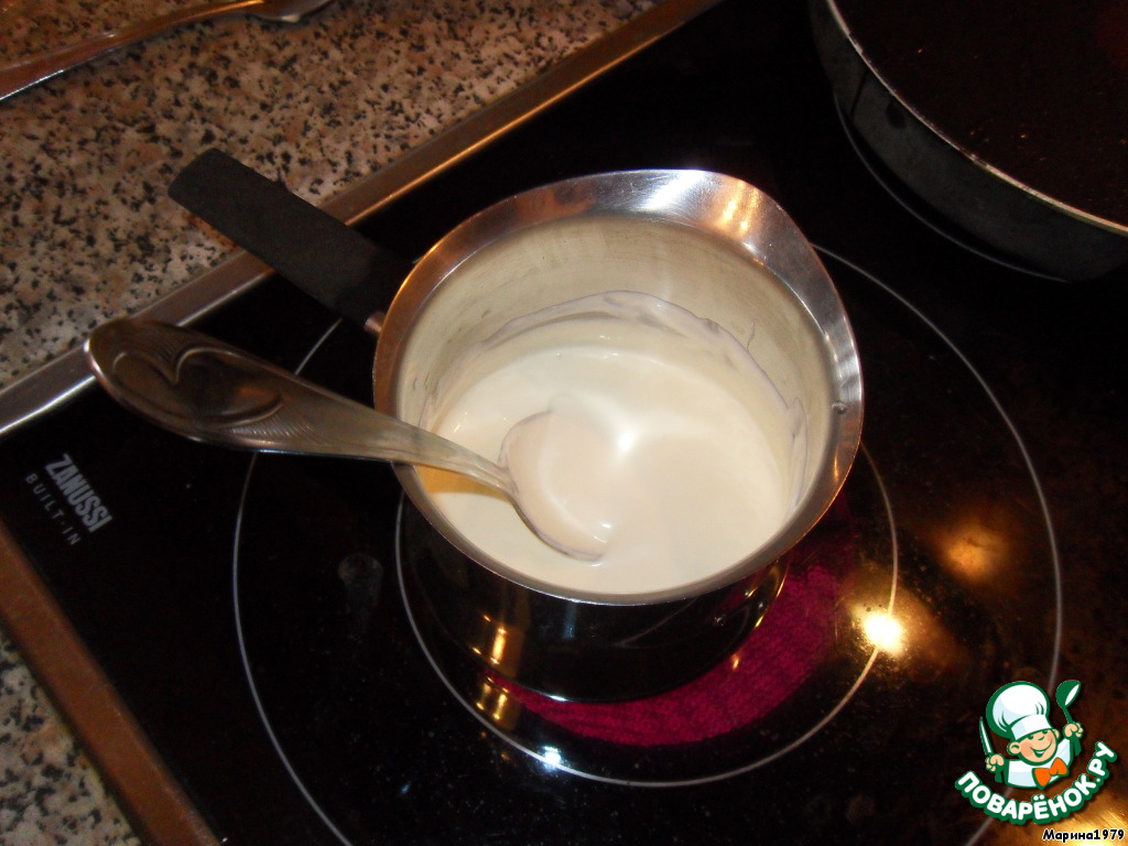 В сотейнике доводим сметану или сливки до кипения и добавляем в муку, помешивая, чтобы не было комочков. Солим, перчим по вкусу.