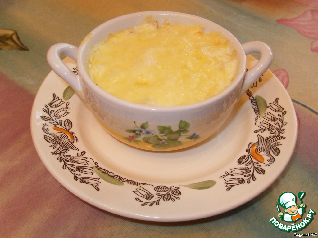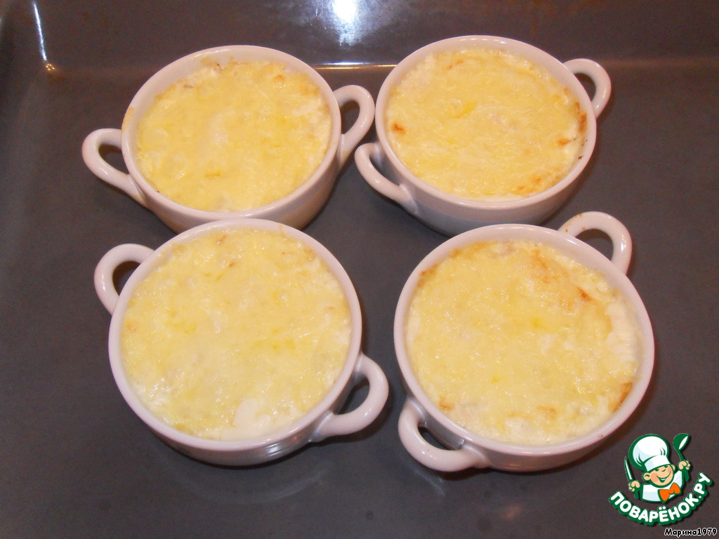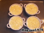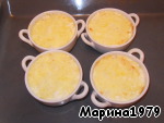 В формочки для жульена выкладываем нашу смесь с курочкой, поливаем сметанным соусом и посыпаем тертым сыром