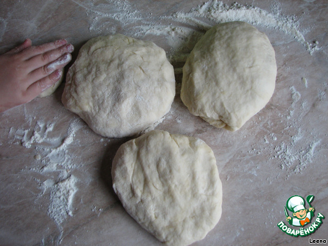 Замешиваем мягкое тесто. Руки постоянно смазываем растительным маслом, чтобы не прилипало тесто. Разделяем на 3 шарика. Для одного пирога нужен только 1 шарик. Из остальных можно сделать хлебные лепешки типа фокаччи, а можно еще 2 таких же пирога. В общем, по усмотрению.