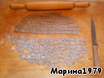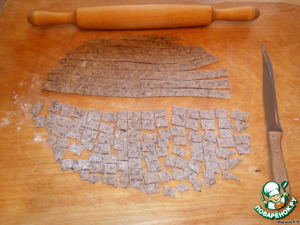 Раскатываем тесто и нарезаем на квадратики примерно 1,5х1,5 см. Нам для супа понадобится половина. Остальные я просто заморозила, использую в следующий раз.