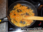 • Режем мелко лук, морковь трем на крупной терке. Обжариваем минут 5, добавляем мелко рубленный чеснок и обжариваем еще пару минут
