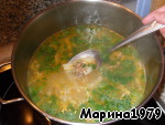• Вынимаем из бульона готовую куриную грудку, бульон солим, перчим по вкусу.