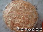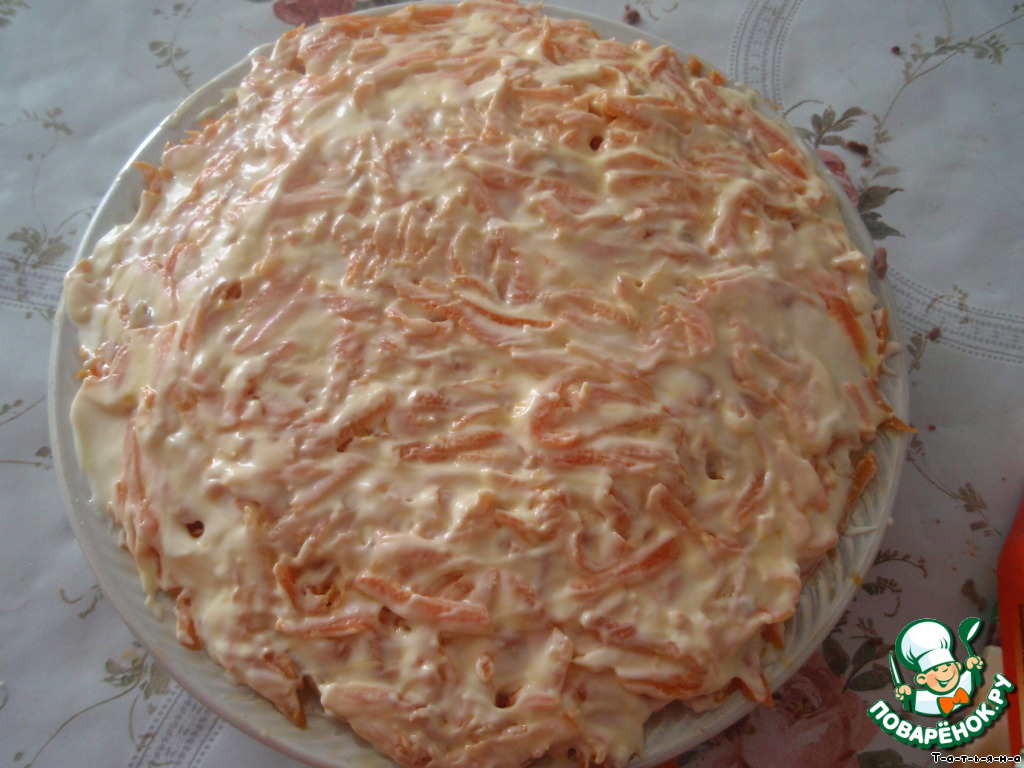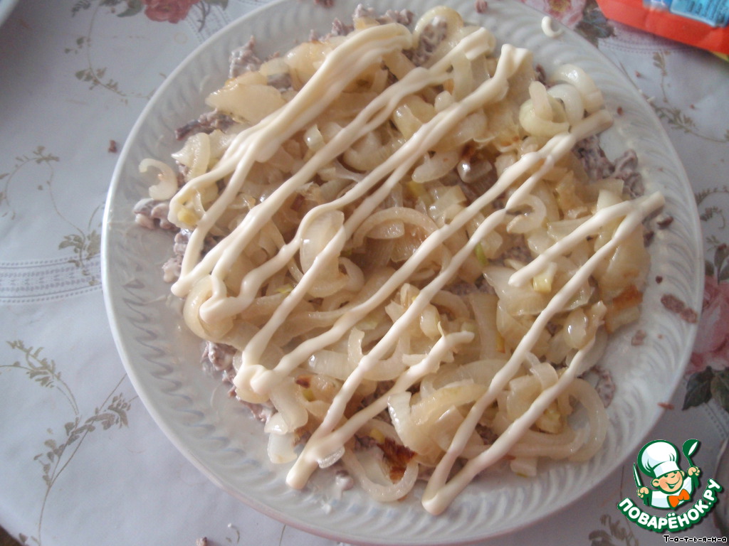 Затем берём салатницу, на дно льём майонез, на него выкладываем