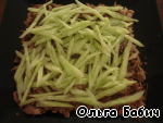 Сверху почищенный и мелко порезанный соломкой огурчик, полить соусом