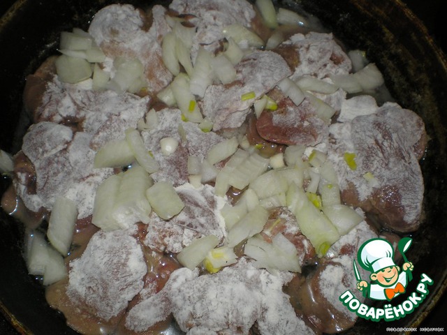 Печень вымыть, посолить, поперчить, обвалять в муке и обжарить на растительном масле, лук нарезать и добавить к печени.