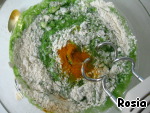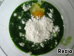 В миску насыпать 350 г муки + 1 яйцо + шпинат + 1 ч.л. оливкового масла + 0,5 ч.л. куркумы. Замесить тесто.