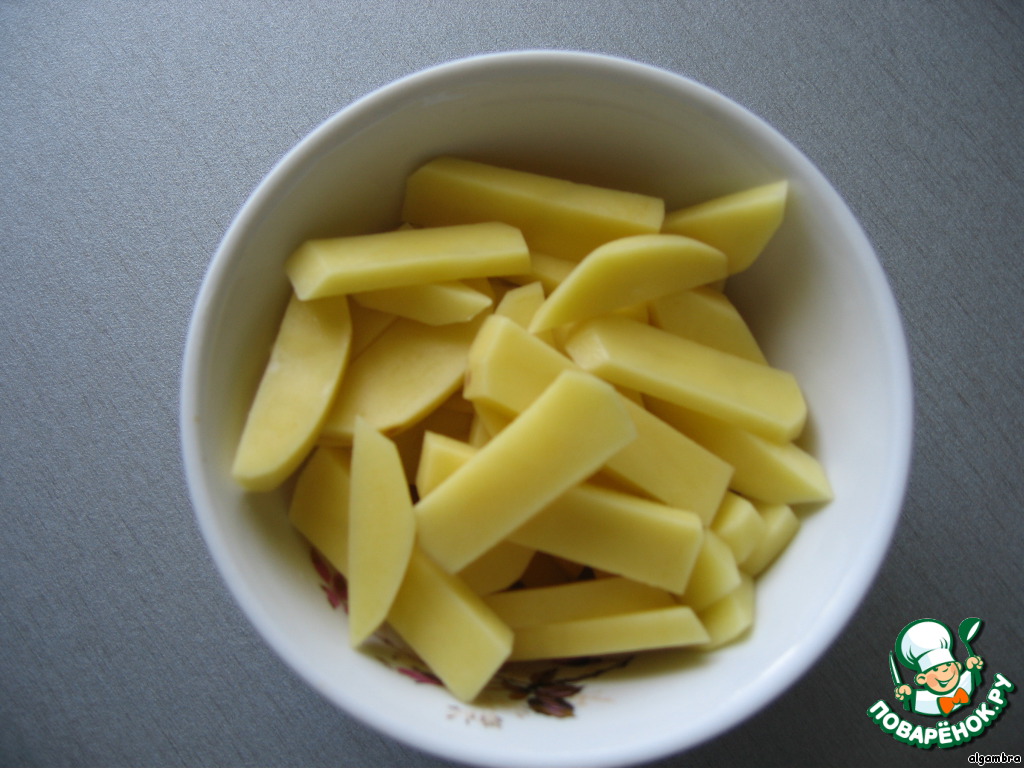 Картофель почистить и порезать брусочками. Когда мясо будет готово, вынуть его из бульона и отложить в сторону (пусть пока остывает). Положить картофель в бульон и варить почти до готовности. -