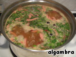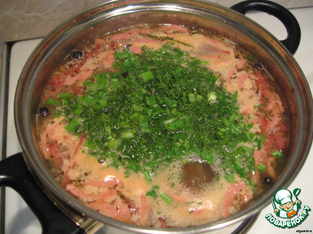 Пока у меня варилось мясо, я успела приготовить и мясную нарезку. Копченую колбасу (у меня был сервелат), молочные сосиски и окорочок копчёный я порезала соломкой. Вся изюминка в том, что из за куриного копчёного окорочка и молочных сосисок солянка получается очень нежной. ;-)