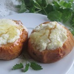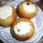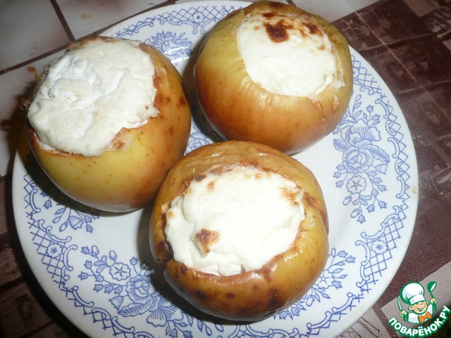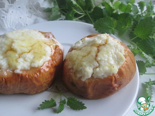 убрать сердцевины, а половину мякоти мелко покрошить, смешать с творогом, яйцом, ванильным сахаром и медом.