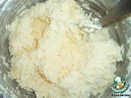 Я сделала начинку из плавленого сыра, яиц, чеснока и майонеза. Сыр и яйца потереть на терку + чеснок (по вкусу) + майонез. Хорошо перемешать.