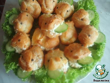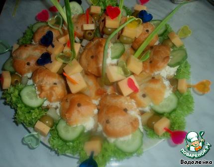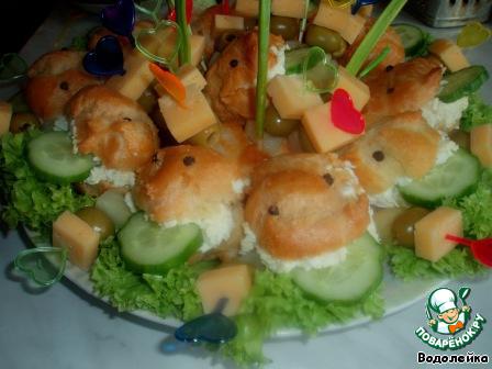 Это очень простая закуска из эклеров. Но оформила я ее в виде лягушек, сидящих в пруду. Идею увидела в журнале. А т. к. такое название, то этот рецептик я посвящаю еще одному нашему поваренку Танюшке (Лягухе). Танюшенька, эти замечательные и вкусные лягушата для тебя.