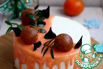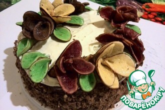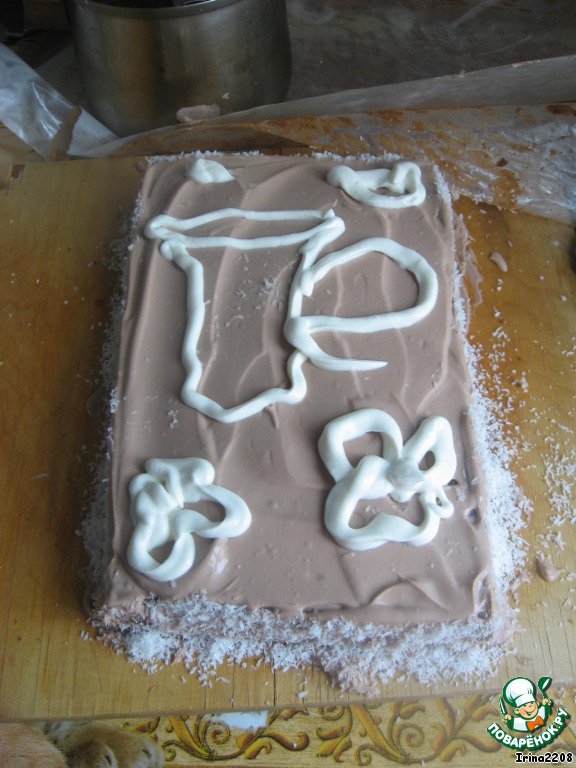 Промазать коржи кремом и украсить, чем Бог послал. Мне он послал кокосовую стружку и немного белого крема (налила его в бумажный корнетик и выдавила рисунок).