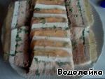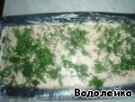 Режем зелень и половину высыпаем на застывший майонезный слой. А на зелень аккуратно выливаем ветчинный паштет. Снова отправляем в холодильник. -