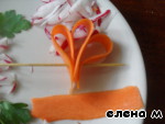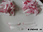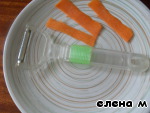 Из дайкона (я для наглядности взяла морковь) ножом для чистки овощей нарезаем ленточки, режем их на кусочки-полосочки по 7-8 см длиной