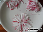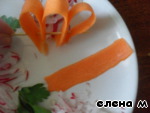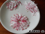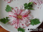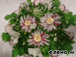 Выкладываем в салатник, посыпаем зеленью, украшаем маргаритками из редиса и ленточками дайкона.