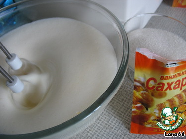 Яйца взбить с горячей водой в пышную пену. Не переставая взбивать, добавить сахар и ванильный сахар.
