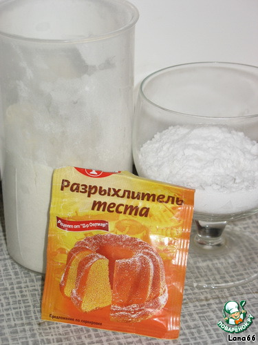 Смешать муку с крахмалом и разрыхлителем. Перемешать, просеять прямо в яичную смесь порциями. Хорошо перемешать.