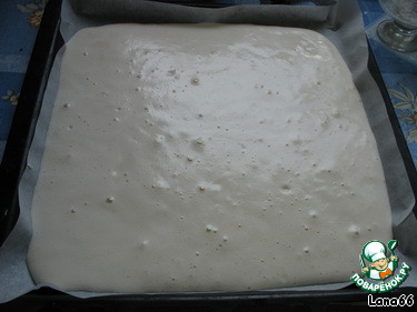 Вылить тесто на выстланный бумагой для выпечки противень. Равномерно распределить на всей его поверхности и выпекать при 200°C около 8-10 минут.