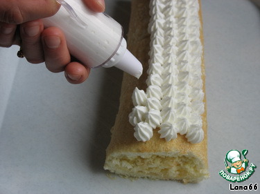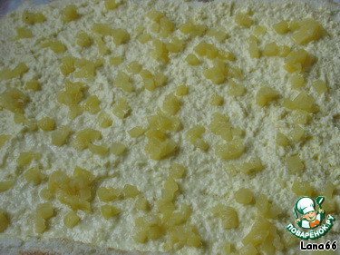 На остывший рулет нанести крем №1 и порезанный мелко ананас. -