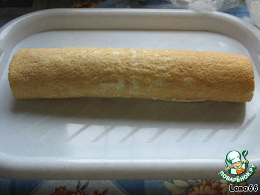 Готовый бисквит выложить бумагой вверх на приготовленное заранее полотенце, посыпанное сахаром. Быстро снять бумагу и свернуть в рулет. Дать остыть.