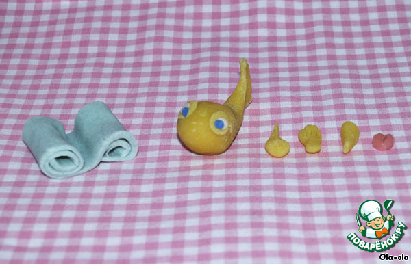 Раскатываем голубой марципан в тонкую пластинку и сворачиваем как в свиток - получается волна. Из желтого марципана лепим саму рыбку и отдельные плавники. Из розового моделируем губки. Получается несколько отдельных частей