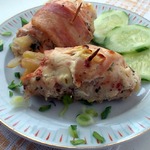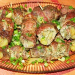 [+5]Делала и со свининой и с куриным филе, в последнем случае заворачивала рулетики в бекон, для сочности, тоже получается вкусно, но со свининой нравится больше.