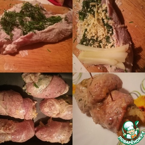 3. Зелень мелко режем. Пластину свинины посыпаем зеленью, кладём 9-10 брусочков картошки на один край, сворачиваем и закрепляем зубочисткой.