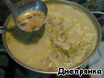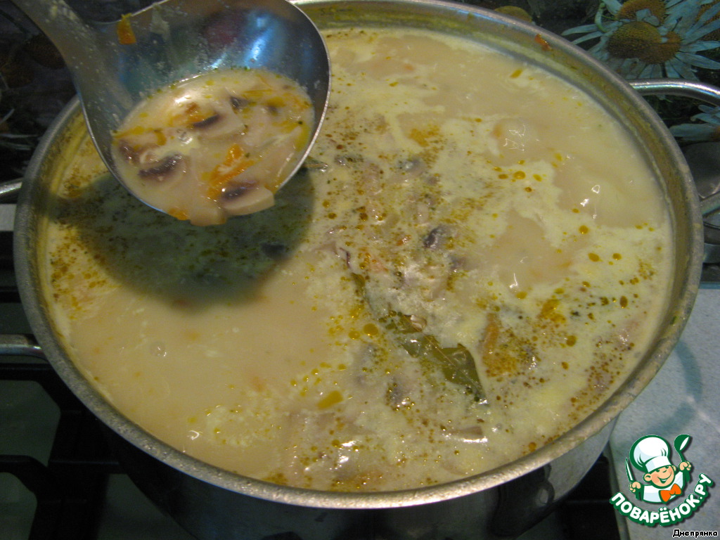 Когда бульон готов, добавляем зажарку, картофель и нарезанные грибы! Затем режем на мелкие кусочки плавленый сыр и добавляем в кипящий суп! Хорошо перемешиваем до тех пор, пока сыр полностью не расплавится! Теперь добавляем грибную приправу (я добавила 4 столовые ложки), дальше специи смотрите по вкусу, так как в этих приправах, в принципе, достаточно и соли и перца!! И в завершение можно посыпать зеленью!