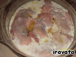 Теперь нашу заготовку кладем в форму и заливаем смесью воды и майонеза. И ставим в разогретую до 200 градусов духовку на 30 - 40 минут. Приятного аппетита.
