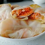 У листьев капусты обрезать утолщения и завернуть в них начинку (тертую морковь). Все овощные голубцы уложить плотно в кастрюлю. Туда же положить нарезанный острый перец чили.
