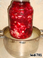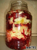 Капусту и свёклу сложила хаотично в 3-х литровую банку, добавила 3-4 зубчика чеснока. Залила тем же рассолом, что и "голубцы".