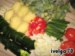 Овощи также моем-чистим. Лук, помидоры и картофель нарезаем кубиками. Чеснок и коржет полукольцами. Бомя вообще-то готовится и в одиночку, без картофеля и кабачков-баклажанов. Но я люблю овощи, вот и расширила рецепт.