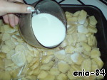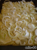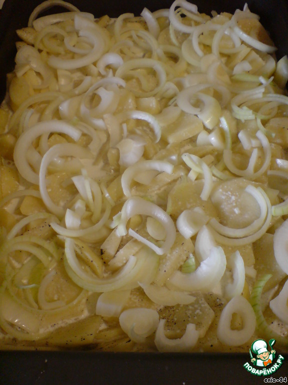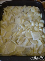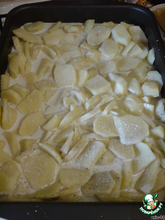• Картофель почистить и нарезать небольшими ломтиками. Посолить и поперчить по вкусу. Форму для выпечки смазать маслом. Выложить в форму картофель.