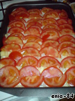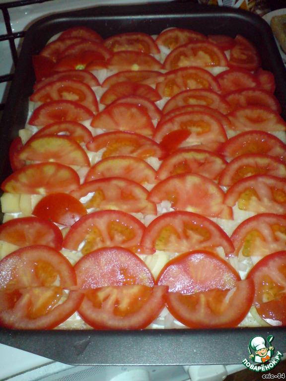 • Помидоры также нарезать полукольцами и выложить на слой лука.