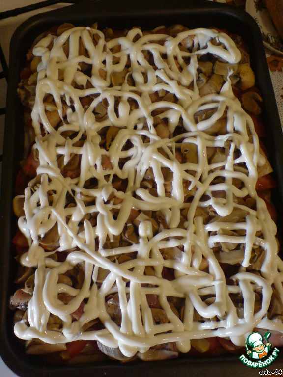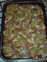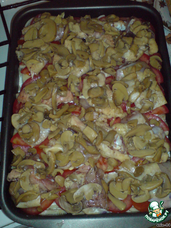 • На курочку выложить грибы. В этом весь секрет. Грибы именно на курицу!