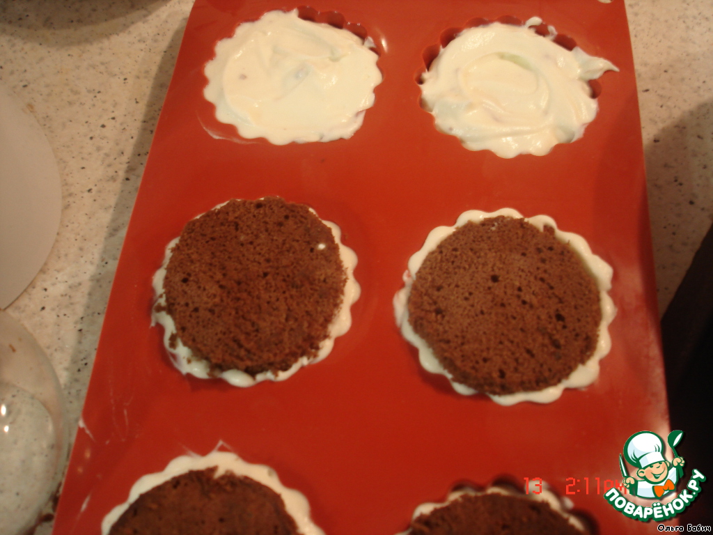 Разложить по формочкам, сверху вырезать стаканом кружки из бисквита. Поставить в холод, дать застыть.