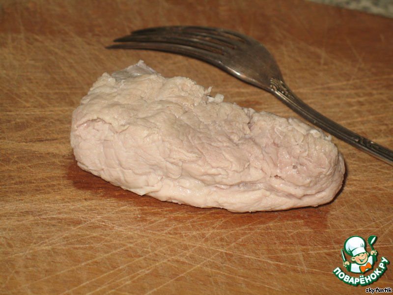 Мясо отвариваем до готовности в немного подсоленной воде. В моем случае это была свиная вырезка - варить минут 30-40. В идеале - должна быть телятина, она самая вкусная в вареном виде. А так же можно использовать говядину