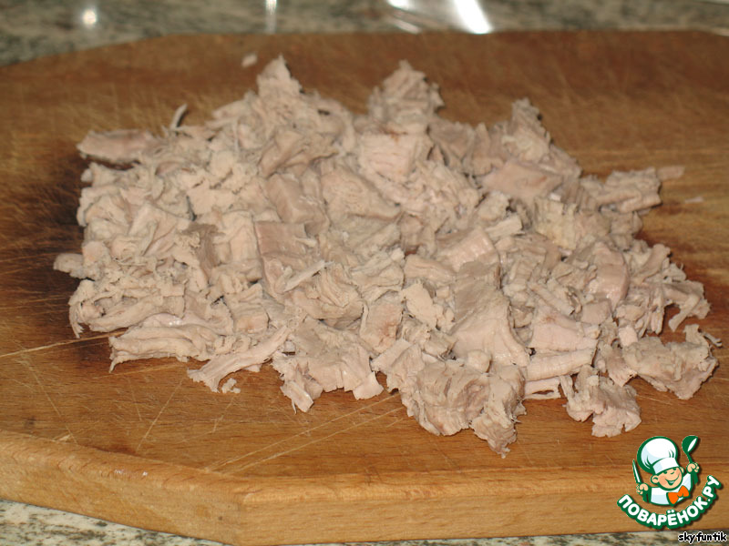 Режем мясо поперек волокон и разделяем на мелкие кусочки