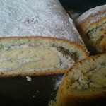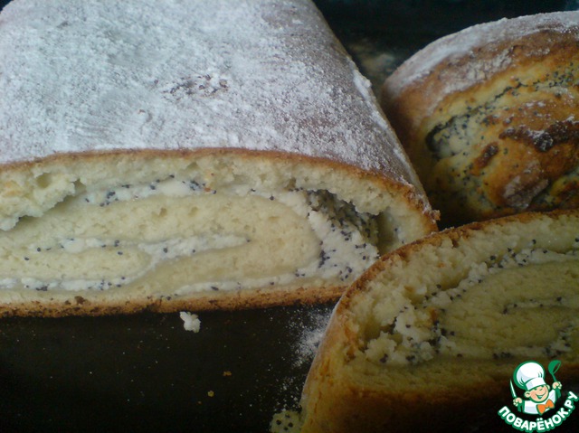 Посыпаем сахарной пудрой, нарезаем на кусочки (если сможете, дайте остыть, лучше форму будет держать, а то у меня под ножом осел немного), но я не смогла ждать...