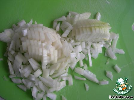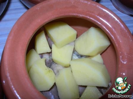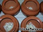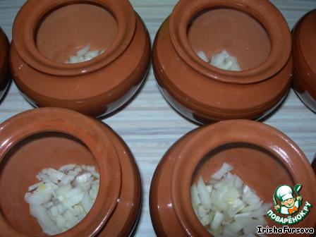 Теперь начинаем сборку! На дно каждого горшочка я налила чуть-чуть растительного масла. Кладем лучок!