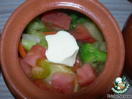 Сверху кусочек сливочного масла и водички до 2\\3 горшка