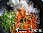 Нарезать лук, болгарский перчик и морковь, сделать зажарку на растительном масле.