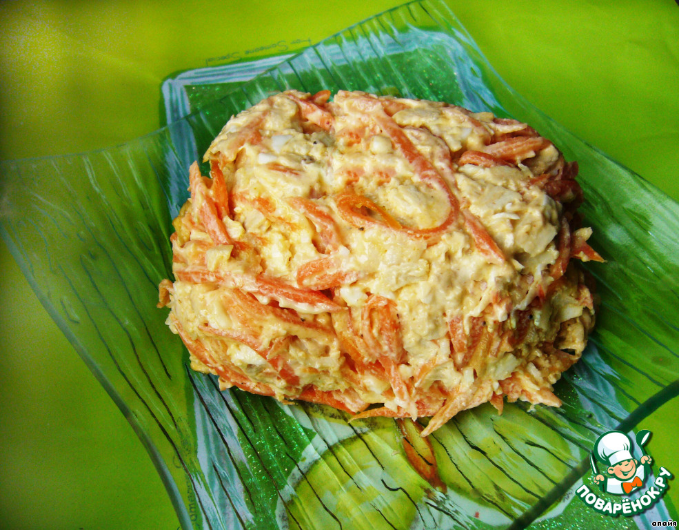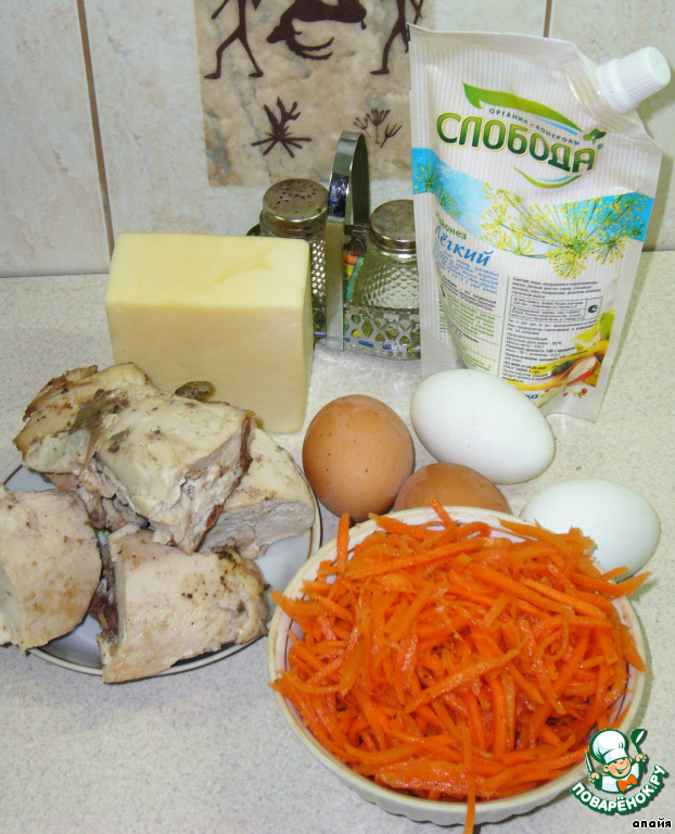 Яйца отварить, измельчить, добавить морковь корейскую,