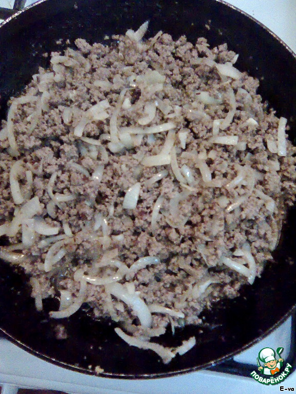 Мясо (не очень постное) пропускаем через мясорубку и обжариваем на сковороде. Чеснок мелко рубим и обжариваем с мясом. Лук разрезаем на 4 части, шинкуем и тоже добавляем к мясу. Солим совсем немного, перчим, добавляем мускатный орех и заливаем апельсиновым соком. Оставляем тушиться минут на 15.