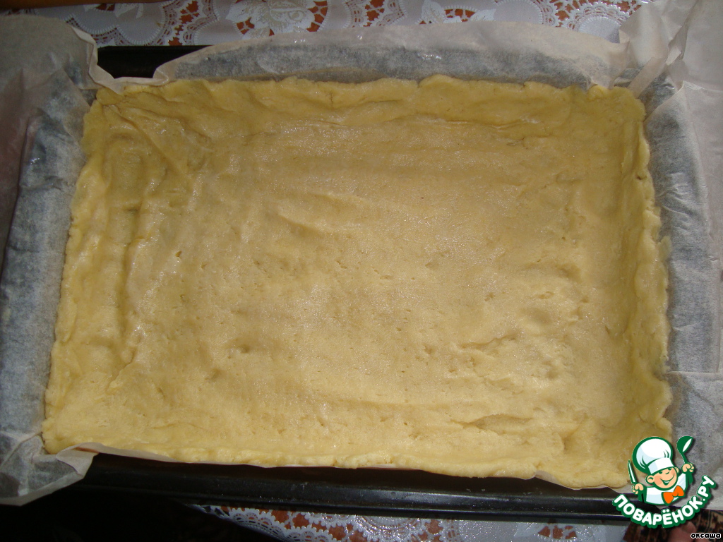 2/3 теста кладем в форму так, чтобы получились бортики высотой 5 см. Форму я застелила пергаментом.