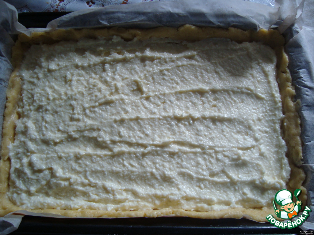 Творог взбиваем с яйцами, сахаром (200гр), растопленным сливочным маслом( 100гр.) до однородной пышной массы. Творожная начинка готова.