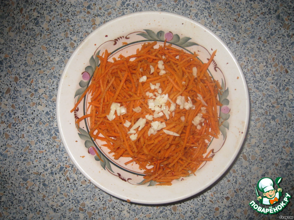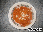 Морковь солим, добавляем уксус и перец с приправой. Пережимаем руками и добавляем нашинкованный чеснок.