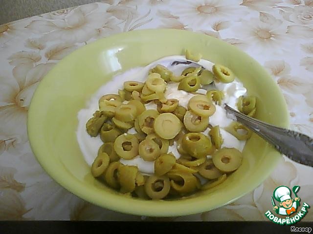 Я люблю майонез, но... вот такой - сметану посолить (как на весь салат) и смешать с оливками, порезанными колечками.