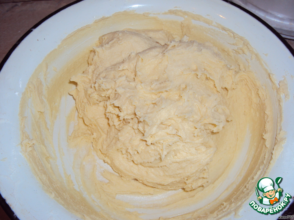 Добавить размягчённый маргарин, соду, погашенную уксусом, 1 пакетик ванилина и муку. Замесить тесто, оно будет немного прилипать к рукам.